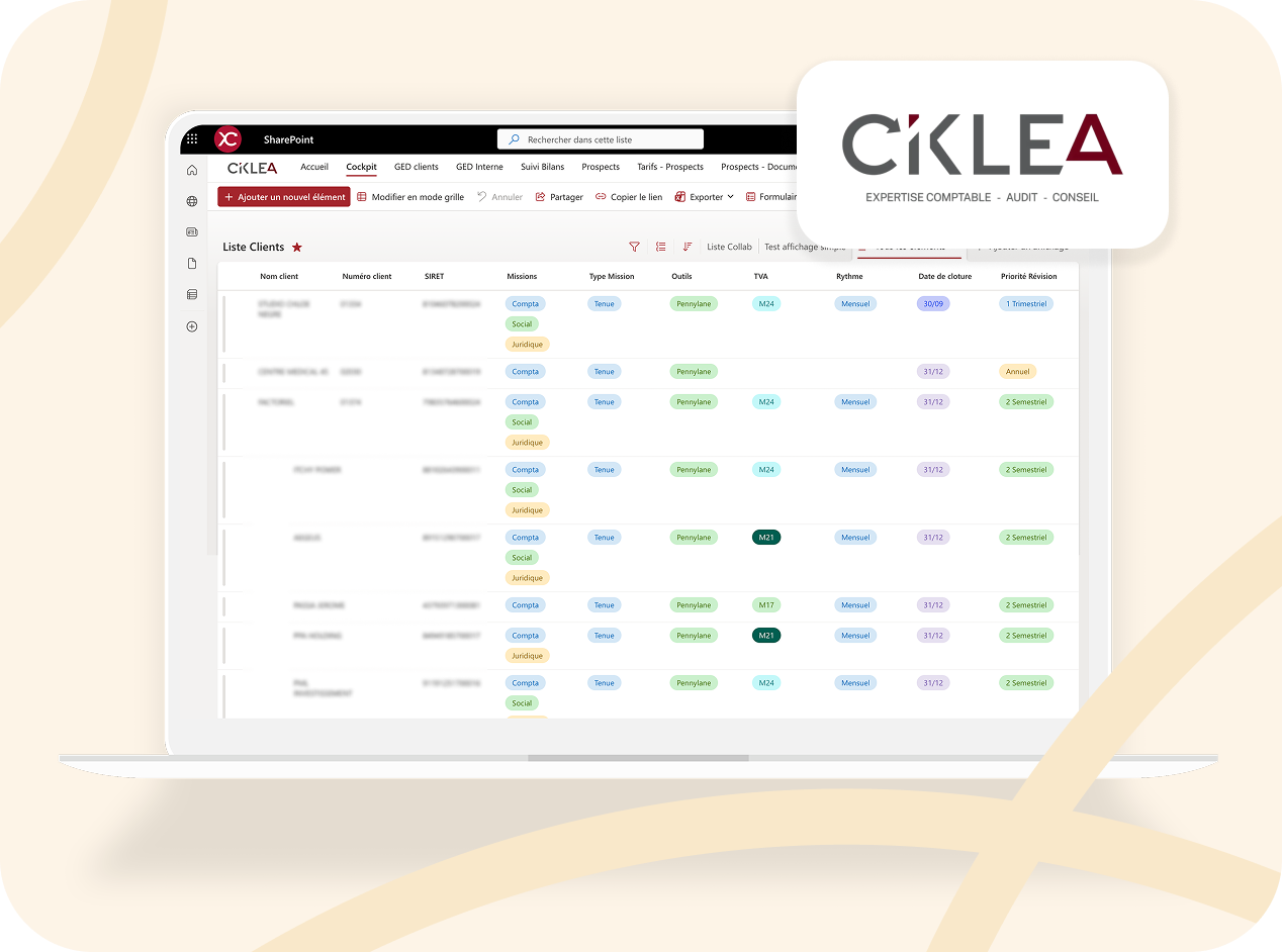 - Automatisation des processus (création d’un nouveau client, suivi des deadlines) via Power Automate