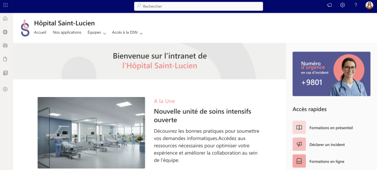| Site de communication | Site hub sharepoint pour centraliser l’information et rediriger les utilisateurs vers différents sous-sites ou outils externes | Organisations avec un écosystème numérique complexe et qui nécessitent un point d’entrée unique | Un espace où le service informatique d’un hôpital peut retrouver les outils métiers et envoyer des formulaires d’interventions |