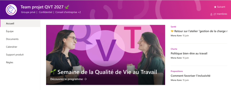 En termes de fonctionnalités graphiques et éditoriales elles sont quasi identiques. La différence principale est que le site d’équipe est connecté à un groupe Microsoft 365, ouvrant l’accès à une boîte Outlook partagée, un calendrier de groupe et un OneNote. Le site de communication, lui, n’est pas connecté à un groupe M365 et reste exclusivement orienté diffusion. Le choix dépend donc moins de l’apparence de l’intranet que de son objectif principal : collaborer ou diffuser de l’information.