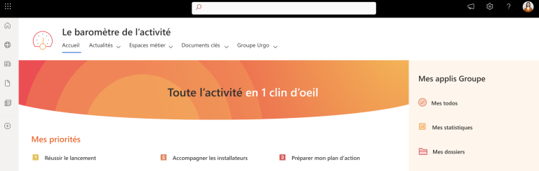 | Site intranet de partage d’actualités, d’événements, gestion électronique de documents (GED) ou site vitrine | Tous les collaborateurs d’une organisation qui a besoin de diffuser des messages et de centraliser des informations pratiques | Intranet groupe proposant des actualités, des espaces métiers (RH, IT, communication, direction) et ressources (onboarding, infos RH) |
