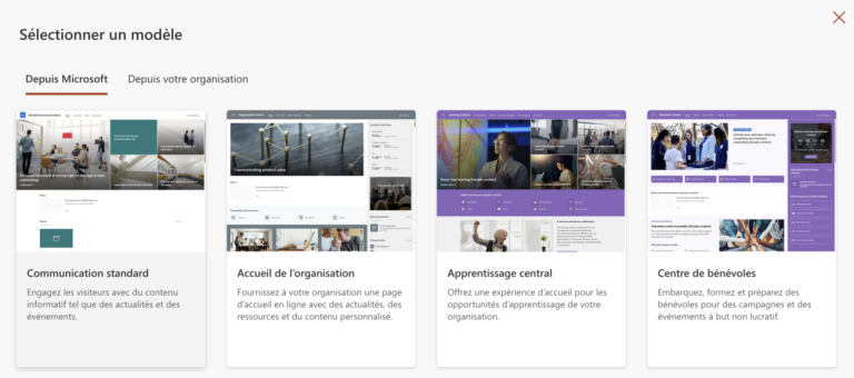 SharePoint propose une galerie de modèles préconçus (RH, projet, événement, communication interne, etc.) dont un modèle standard pour la communication et un modèle vierge.